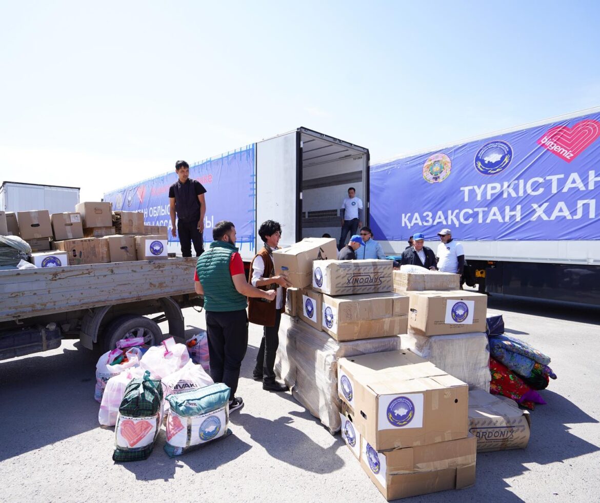 Түркістан облысының тұрғындары еліміздің су басқан өңірлеріндегі жағдайға алаңдаушылық танытып, өз көмектерін көрсетіп жатыр. Облыс әкімі Дархан Амангелдіұлының тапсырмасымен өңірде гуманитарлық көмекті үйлестіретін штабтар құрылып, жұмыс істеп жатыр. Су тасқыны болған уақыттан бері өңірден Батыс Қазақстан, Ақтөбе, Атырау облыстарына 371 тонна гуманитарлық көмек жөнелтіліп, еріктілер көмекке барды. Ал бүгін Түркістан халқы атынан 9 ауыр жүк көлігі мен қосымша көліктерге тиелген 200 тоннаға жуық кезекті гуманитарлық көмек керуені жолға шықты. Онымен бірге 50 ерікті жас арнайы автобуспен жіберілді. Олар су тасқыны салдарын жою, ұйымдастыру жұмыстарына атсалысады.