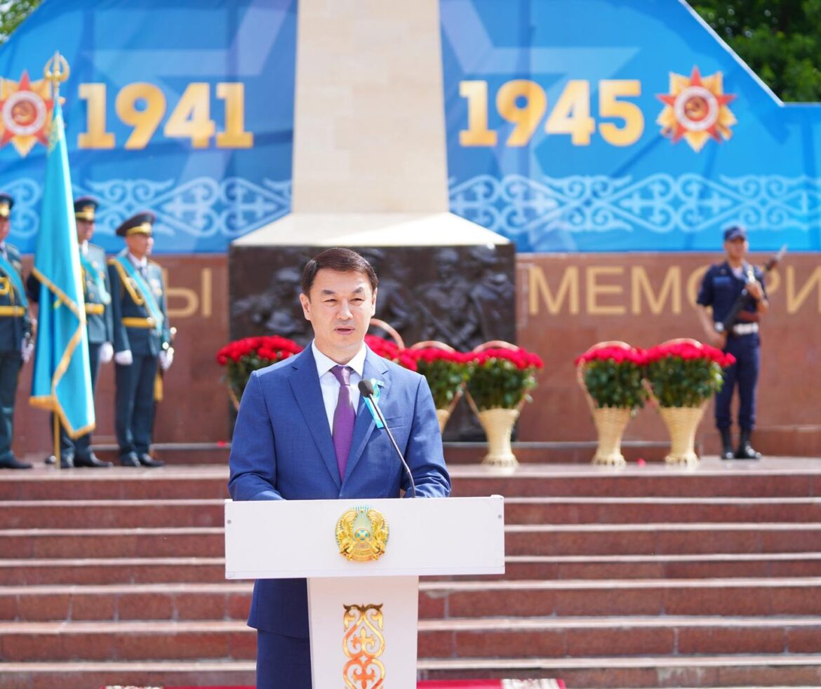 – Баршаңызды Жеңіс күнімен шын жүректен құттықтаймын! Даңқты қолбасшы Бауыржан Момышұлы «Ерлік – тайсалмас табандылық пен қайыспас қайсарлықтан шығады» дей келе азаматтарды ерлік жасауға шақырған. Бұл ретте Қазақстанымыз ержүрек батырларымен мақтанады. Мемлекет басшысы Қасым-Жомарт Тоқаевтың Жеңіс күнімен құттықтауында «Қазақстан адамзаттың ортақ жеңісіне, жер бетінде әділдік пен бостандықтың салтанат құруына өлшеусіз үлес қосты. Аға буынның екінші дүниежүзілік соғыс кезіндегі ерлігі мен еңбегі өскелең ұрпақ үшін қайсарлықтың, жанқиярлықтың және отаншылдықтың озық үлгісі болып қалатыны сөзсіз»,-деді. Биыл Ұлы Жеңіске 79 жыл толып отыр. Адамзат тарихындағы ең алапат сол майданда қазақ халқы шешуші рөл атқарғаны белгілі. Еліміздің ержүрек жігіттері мен қайсар қыздары әлемде бейбітшілік туын желбірету үшін қан төкті. Ерлік көрсетіп, Ұлы Жеңіске үлес қосты. Тылда еңкейген қария мен балалардың өзі күндіз-түні еңбек етіп, жеңісті жақындатты. Сондықтан Ұлы Отан соғысының ардагерлеріне құрмет көрсету, олардың ерліктерін ұрпаққа дәріптеу – ортақ міндет. Өйткені, біз – жеңімпаз буынның ұрпағымыз! Ардагерлерімізге, олардың ұрпақтарына амандық, шаттық тілеймін! Биыл Кеңес одағының батыры, алғашқы Қорғаныс министрі Сағадат Нұрмағамбетов пен Халық Қаһарманы, Рейхстагқа ту тіккен Рақымжан Қошқарбаевтың туғанына 100 жыл толып отыр. Қос қаһарманның ерлікке толы өмірі – ұрпақ үшін өнеге! Біз ардагерлеріміздің ерлігін ұмытпаймыз және мәңгі есте сақтаймыз! Елімізде әрқашан бейбітшілік заман, ұрпағымыз аман болсын! Тәуелсіз еліміздің мәртебесі биіктей берсін! – деді Дархан Сатыбалды.