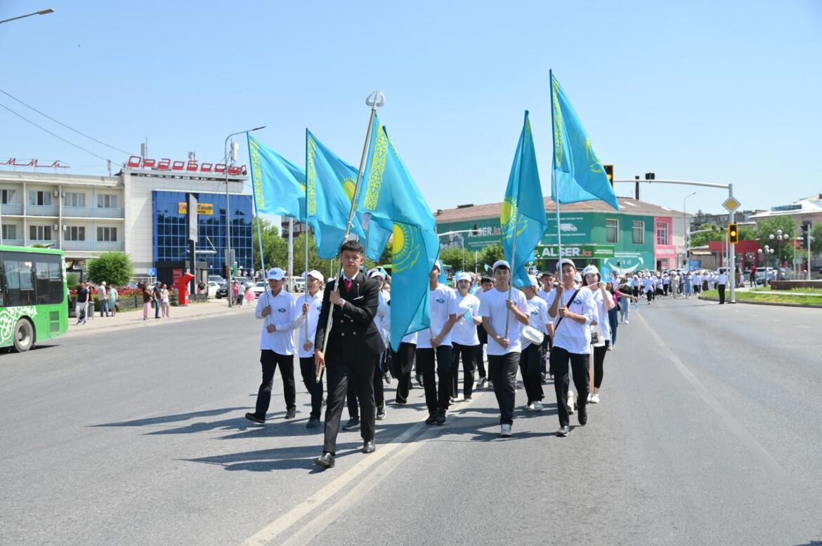 Рәміздер алаңынан басталған патриоттық жиын одан әрі жастар шеруіне ұласты. Шеруге 600-ге жуық жас, қаладағы 8 жоғары және орта арнаулы оқу орындарының шәкірттері қатысты. Олар Қазыбек би, Төле би, Әйтеке би көшелері бағыты бойынша сап түзеп, рәміздерді насихаттады. Ту ұстаушы жастардың арасында қазақ күресінен әлем чемпионы Марат Байқамұров та болды.