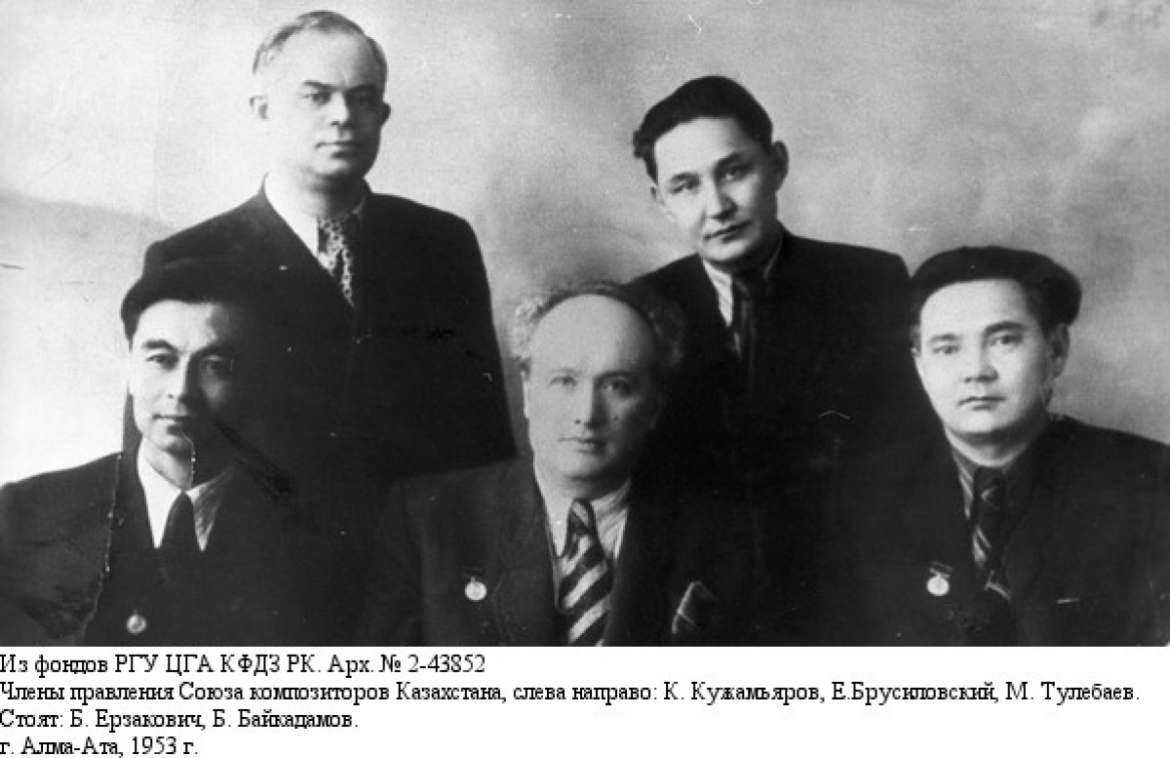 Кейіннен 1959-1960 жылдар аралығында Қазақстан Композиторлар одағына М. Төлебаев төрағалық еткен болатын. Алғашқыда бұл мекеме еліміздегі композиторлар мен сазгерлердің жұмысын ұйымдастырып, шығармаларын елге таныту мақсатында құрылған болса, ал 1957 жылы оның атауы Ұйымдастыру комитетінен Қазақстан Композиторлар Одағы болып өзгертілді. Одақтың алғашқы төрағасы болып Евгений Брусиловский сайланған болатын.