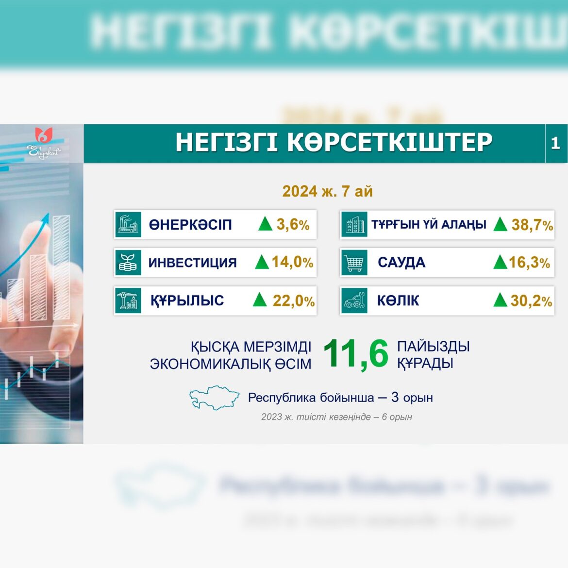 Биылғы жылдың 7 айының қорытындысы бойынша өткен жылдың сәйкес кезеңімен салыстырғанда қаланың әлеуметтік-экономикалық көрсеткіштерінде тұрақты өсім бар. Қаланың қысқа мерзімді экономикалық өсімі 11,6 пайызды құрап, республика бойынша алғашқы 3-орынға көтерілген (2023 жылдың тиісті кезеңінде – 6 орынды құраған).